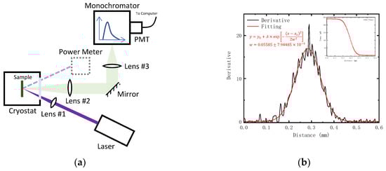 (a) A schematic of the experimental apparatus in which the power meter shown with dashed line is used to improve the accuracy of the experiment mentioned in the section of discussion; (b) The gaussian fit result of derivative of measured data at excitation power of 250 mW as described in the inset to determine the spot radius on the sample using the knife-edge method.
