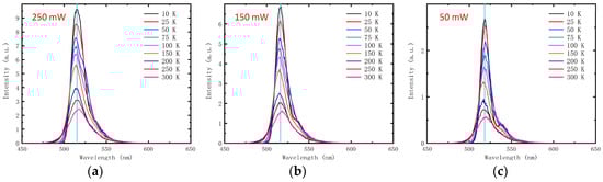 The spectra at different temperature and excitation power of (a) 250 mW, (b) 150 mW and (c) 50 mW. The blue lines designating central wavelengths (CWs) at low temperature (LT) are shown to observe the shift clearly.