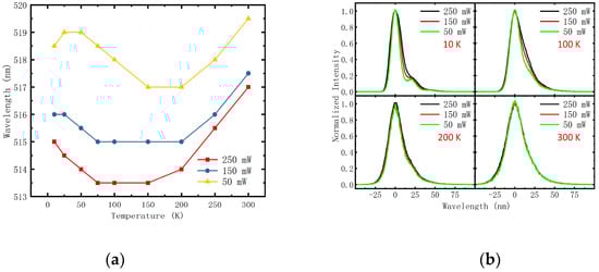 (a) Central wavelengths (CWs) at different temperature and three fixed excitation power; (b) Spectra at different temperature and three fixed excitation power which are normalized and shifted to a same CW.