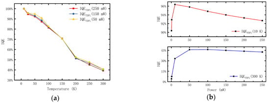 (a) The internal quantum efficiency (IQE) values calculated by temperature dependent photoluminescence (TDPL) results at different temperature and three fixed excitation power; (b) The IQE values calculated by power dependent photoluminescence (PDPL) results at different excitation power and two fixed temperature.