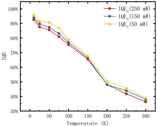 which should be close to IQE values at RT measured by PDPL experiment to make sure PDPL results are trustworthy. For instance, equals 92.68% and the proportion of IQE values at LT and RT we acquired by TDPL experiment equals 39.26%. So, the more accurate IQE value at RT can be calculated as . The modified results, which are in line with PDPL results at RT, are shown in Figure 6. It is reasonable to believe that the IQE values obtained are relatively more accurate.