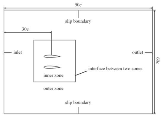 In order to save computation resources and time while keeping a high simulation accuracy, the computation domain of the parallel foils is divided into several parts. The region close to the parallel foils is the inner zone, and the region outside the inner zone is the outer zone, as shown in Figure 2. Along the parallel foils’ surface, the no-slip boundary condition is adopted. The interface between the inner and outer zone is set as the interface which connects the structured mesh and unstructured mesh. The velocity inlet is defined as U∞ = 1 m/s and the pressure outlet is set. Based on the C programming language, the plunging and pitching motion characteristics in all simulations are controlled by the user-defined function (UDF) in Fluent. The dynamic mesh technique is applied to realize the reasonable transformation and reconstruction in the inner zone during the oscillation process, the quality of grids around the parallel foils is kept at a proper accuracy.