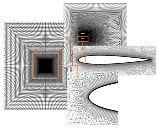 As displayed in Figure 3, large transformation due to the oscillation of foils occurs in the inner zone grid. Thus, the unstructured mesh is selected for the inner zone, which is denser and where it is easier to improve the grid quality. The structured mesh is adopted at the foil surface to ensure the computation accuracy of the boundary layer near the foil surface. For the outer zone, there is a much smaller transformation during oscillation, so the sparse structured mesh is used here to save the computation time. The mesh contains 7.5 × 104 cells, the height of the first cell in the boundary layer is set as 10−5c to satisfy the computation accuracy.
