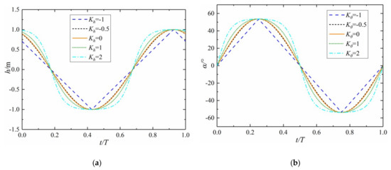 In this paper, different non-sinusoidal plunging motions and non-sinusoidal pitching motions are considered, including the cases under Kh = −1, −0.5, 0, 1 and 2 as well as the cases under Kθ = −1, −0.5, 0, 1 and 2. The curves of the five non-sinusoidal plunging motions and non-sinusoidal pitching motions at k = 0.8 are presented in Figure 4a,b, respectively.
