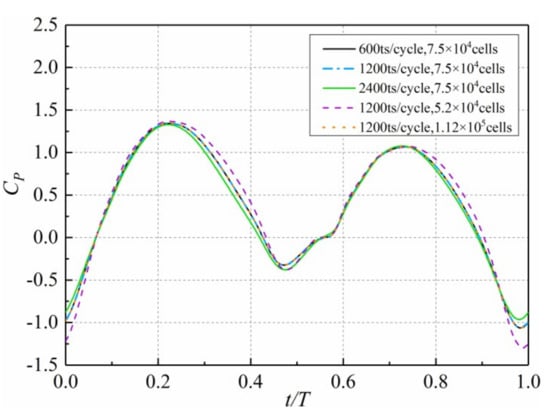 The grid independent and time-independent validation are conducted to ensure that the mesh strategy adopted and the time step set in the simulation have no influence on the analysis accuracy. As shown in Figure 5, three kinds of grids are selected, which are 5.2 × 104 cells, 7.5 × 104 cells and 1.12 × 105 cells, respectively. At the same time, three kinds of time steps are adopted, which are 600, 1200 and 2400 time steps in one oscillation cycle, respectively. The variations of the transient power coefficient CP in a cycle are obtained. The difference between the three kinds of mesh strategies is small enough to ignore. Additionally, the results among the tested time steps show little difference. Thus, the mesh strategy with 7.5 × 104 cells and 1200-time steps per cycle are adopted in all numerical simulations.