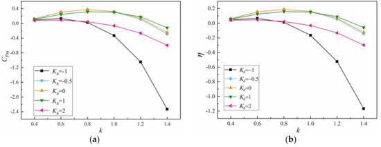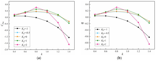 The CPm and η of parallel foils at different Kθ: (a) CPm curves under different k; (b) η curves under different k.