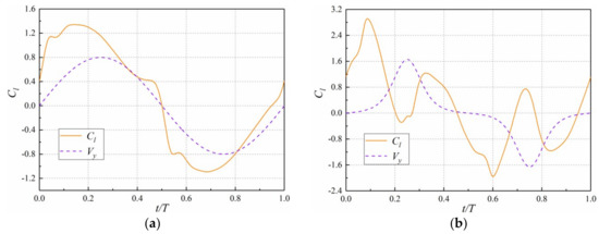Figure 11 shows the Cl curves of the upper foil under two typical non-sinusoidal pitching motions Kθ = 1 and Kθ = 2 at k = 0.8. In these two cases, the plunging oscillation of the foil moves as with the same sinusoidal plunging motion. However, because of the effect from the non-sinusoidal pitching motion, the flow field around the foil is different, resulting in different forces in the y-direction. That is to say, the different pitching motions that cause different Cl values in the plunging motions are the same. This explains the reason for different CPhm at the same k in Figure 10. From Figure 11, it is observed that the synchronicity of Cl and Vy at these two motions is similar. When Kθ is 2, Cl fluctuates obviously near the plunging limited position, the peak value of Cl is higher. At the same time, Cl in an oscillation cycle at Kθ = 2 is higher than that at Kθ = 1 in general. Thus, from Figure 10 and Figure 11, the case with Kθ = 2 extracts more energy.