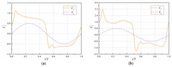 The amount of energy extracted during the plunging oscillation process is related to the synchronicity between the lift coefficient Cl and the plunging velocity Vy. The Cl curves of the upper foil at Kh = 0 and Kh = 2 with k = 0.8 are shown in Figure 8. By comparing these two cases, it is concluded that the synchronicity of Cl and Vy is better at Kh = 0. While the synchronicity is not well at Kh = 2, even the totally opposite trend of Cl and Vy during t/T = 0.17–0.3 and t/T = 0.67–0.81 is observed. Although the peak value of Cl at Kh = 2 is obviously higher than that at Kh = 0, the CPm at Kh = 2 is relatively low because of the bad synchronicity of Cl and Vy. Thus, the energy extraction characteristics of foil are relatively poor when Kh = 2.