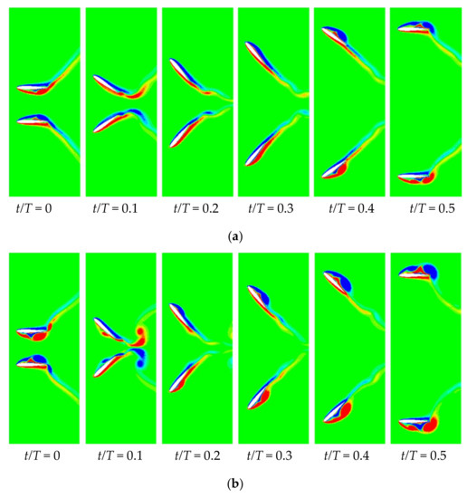 To analyze the difference of the Cl curve at different non-sinusoidal pitching motions in Figure 11, we discuss the evolution of the vortex field around parallel foils in the cases of Kθ = 1 and Kθ = 2 during t/T = 0–0.5. Comparing the vortex field in Figure 12a,b, it is found that the vortex structures at Kθ = 2 are bigger than those at Kθ = 1 during every moment. The bigger low-pressure area is formed because of the bigger vortex structure, increasing the lift force. So Cl at Kθ = 2 is higher than that at Kθ = 1 in Figure 11. The Cl curve in Figure 11b has a significant fluctuation near t/T = 0.05, combining with Figure 12b. It is concluded that a big trailing edge vortex sheds at this time, causing a sharp change of Cl. Meanwhile, the leading edge vortex is formed earlier at Kθ = 2.