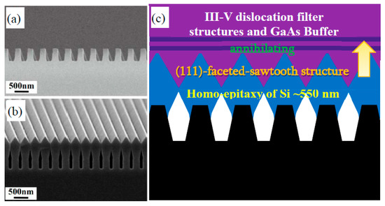 Recently, by using U-shaped patterned Si (001) substrates, we obtained (111)-faceted-sawtooth Si hollow structures by homo-epitaxy [69]. The in-situ hybrid epitaxy of InAs/GaAs on such Si substrates can be realized to achieve highly efficient 1300 nm and 1550 nm emission by using a dual chamber MBE. As shown in Figure 2a, the U-shaped patterns are fabricated by a standard process on standard 8-inch on-axis Si (001) substrate, by using a SiO2 hard mask, deep ultraviolet (DUV) lithography, dry etch, and removal of SiO2 in diluted hydrofluoric acid (HF) solution. The U-shaped patterns have a period of 360 nm with a ridge width of 140 nm and a depth of approximately 500 nm. After cleaving into 32 mm × 32 mm dies and ex-situ chemical cleaning, the samples are loaded into the SiGe MBE chamber for growth. After 550 nm Si growth, the (111)-faceted sawtooth hollow structures are obtained, as shown in Figure 2b, which can be used for a subsequent in-situ GaAs buffer layer and III-V QD laser structure growth. The formation of the hollow structure in Si can partially reduce the thermal mismatch between the epitaxial GaAs layer and Si substrate. By reducing the period of the U shape structures in the initial Si (001) substrate, we may achieve a (111)-faceted sawtooth structure by depositing a thinner Si buffer layer. The entire epi-structure for GaAs buffer growth on Si is schematically shown in Figure 2c.