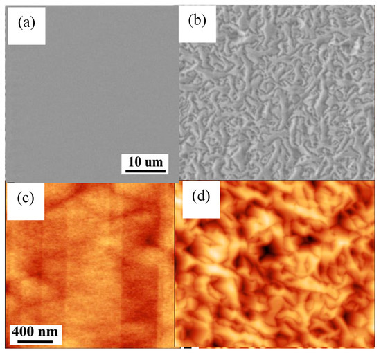 In order to verify the influence of (111)-faceted-sawtooth Si (001) hollow structure on defect suppression at the GaAs/Si interface, surface SEM images of identical GaAs structures directly grown on a (111)-faceted Si and standard Si are compared here, as shown in Figure 4a,b, respectively. The images of the atomic force microscope (AFM) with the scanning area of 2 μm × 2 μm are shown in Figure 4c,d. It is clear that a high quality GaAs buffer layer with a root-mean-square (RMS) roughness of approximately 0.4 nm can be obtained on (111)-faceted-sawtooth hollow Si (001) substrates, comparing with the rough surface for the InAs QDs structure on a standard Si (001) substrate. The great surface flatness and low defect density are contributed to by the designed (111)-faceted Si hollow structure. The Si (111) facets can effectively annihilate the APDs generated at the GaAs/Si interface by simply changing the propagating direction of Ga-Ga and As-As APDs from a vertical direction to 54.74 °C. Therefore, the generated APDs can join and annihilate within 30 nm from the interface, which effectively reduce the propagating defects into the upper structures. By applying this technique, a high quality GaAs surface can be created as shown in Figure 4, that leads to an essential platform for the hybridization of a III-V photonic structure on Si substrates.