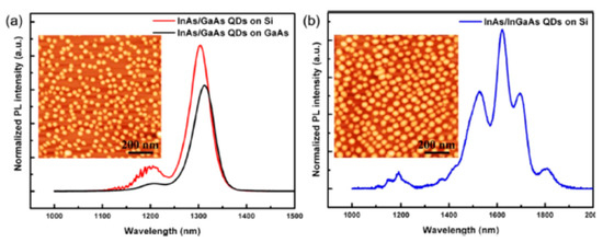 A 10 nm AlAs nucleation layer was grown prior to the buffer layer growth on the (111)-faceted sawtooth hollow Si (001) substrate, and it significantly reduced the anti-phase boundary density at the III-V/Si interface due to the higher bonding energy of AlAs [39,46]. The 600-nm thick GaAs buffer layers were then grown using a two-step method to flatten the sawtooth structure-induced geometric unevenness. An APD-free surface can be obtained then by migration-enhanced epitaxy (MEE) of the GaAs nucleation layer and two-step GaAs growth of 40 nm and 560 nm at 380 °C and 580 °C, respectively. In0.15Ga0.85As/InAs quantum wells as dislocation filter layers (DFLs) were grown on a flattened surface with 200-nm GaAs spacing layers in-between to effectively reduce the dislocation density, followed by active QD layer growth. The separation GaAs layer was grown at 480 oC, and the DFLs consisted of five periods of 10 nm In0.15Ga0.85As/10 nm GaAs. To further reduce the threading dislocation density (TDD), an additional two periods of In0.15Al0.85As/GaAs DFLs were utilized, which consisted of five-periods of 10 nm In0.15Al0.85As/10 nm GaAs strained layers separated by 200 nm GaAs. Finally, five periods of GaAs/AlGaAs superlattices (SLs) separated by a 50 nm GaAs spacing layer were deposited at 580 °C to achieve a smooth GaAs surface for the flattening process. Each SL has 10 periods of 2 nm GaAs/ 2 nm Al0.6Ga0.4As alternating structures, followed by a 200 nm GaAs grown at 560 °C [69]. For O-band light emission, a standard five-layer InAs/GaAs dot-in-a-well (DWELL) structure was grown on this GaAs/Si substrate. Each DWELL layer consisted of a 3.1 monolayer InAs QD layer sandwiched by a 2-nm In0.14Ga0.86As wetting layer and a 6-nm In0.14Al0.86As capping layer. The DWELLs were separated by a 50-nm GaAs spacing layer, which was grown at 560 °C. For the C/L-band emission of InAs QDs, step-graded metamorphic InGaAs buffer layers were introduced as previously presented [68]. Thermal cycle annealing was utilized to further improve the flatness and quality of InGaAs layers. The active region consists of three periods of InAs QD layers grown at 450 °C. Each of the InAs QDs layers consists of 3.1 monolayer InAs capped by a 4-nm In0.3Ga0.7As layer and separated by a 45-nm In0.3Ga0.7As spacing layer grown at 500 °C. Further details of InAs/GaAs QD growth can be found in References [68,69]. Cross-sectional TEM measurements were carried out to characterize the crystalline quality of the active regions. Figure 3a,b shows defection-free and high-quality DWELL structures for both samples, with insets illustrating the high resolution TEM images of individual InAs QDs. As presented above, a step-graded InGaAs metamorphic buffer was inserted to obtain InAs/InGaAs QDs with an emission wavelength extended to 1550 nm on a GaAs/Si (001) substrate. In addition, as shown in the insets, the size of QD increases for the C/L-band active region.