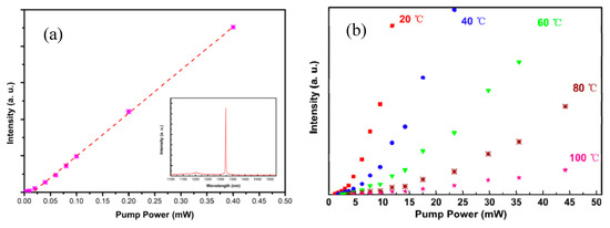 A micro-PL system with a continuous wave (cw) pump laser at 532 nm was used to characterize the laser operation of InAs QD micropillar cavities on Si (001). The laser characteristics (L-L curves) of InAs QD micropillar laser on Si substrate with a mesa diameter of 15 μm is shown in Figure 7a. By linear fitting the L-L curve, the laser threshold pump power is approximately calculated to be 20 μW. Figure 7b shows the plot of integrated PL intensity of InAs QDs micropillar with increasing pump power at different operating temperatures ranging from 20 to 100 °C. During the experiment, the red-shift of laser emission wavelength is observed with increasing operation temperature by approximately 0.165 nm/°C. The results indicate the great temperature stability of InAs/GaAs QD microcavity lasers on Si (001) hollow structure as a potential platform for III-V optoelectronic devices on standard Si (001) substrates. With reduced density of InAs QDs, such a structure can also be implemented as a silicon-based single photon source for quantum information applications.