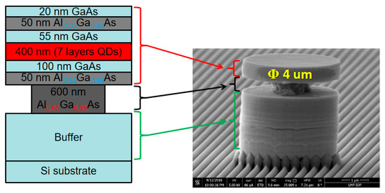 Optically-pumped InAs/GaAs quantum-dot micropillar laser on an exact Si (001) by a (111)-faceted Si hollow structure has been achieved through the standard fabrication process, including photolithography and dry etch. By calculation, the distributed Bragg reflectors (DBRs) and an active layer with specific thicknesses have been grown on an ultra-flat GaAs/Si (001) substrate. The cross-sectional SEM image of the whole structure is shown in Figure 6a. The DBRs consist of 33.5 bottom and 15 top pairs of alternating quarter-wavelength thick GaAs/AlAs layers, which are 94.2 nm GaAs and 111.1 nm AlAs, respectively. They were grown at an optimum temperature of 610 °C and 560 °C. The active layer in the center of one wavelength-thick GaAs cavity is sandwiched between the top and bottom DBRs. The active layer contains five periods of InAs/GaAs dot-in-a-well (DWELLs) structures, each of which consists of a 3.1 monolayer InAs QD layer sandwiched by a 2 nm In0.143Ga0.857As wetting layer and 6 nm In0.143Al0.857As capping layer. With only 250 nm GaAs buffer layer grown on (111)-faceted sawtooth hollow Si (001) substrate, subsequent DFLs can be deposited and followed by micropillar laser structures consisting of DBRs and an active layer. The QD micropillar laser structures on Si(001) were fabricated with diameters ranging from 15 to 250 μm, as shown in Figure 6b. Figure 6c shows the tilted SEM view of the micropillar laser, indicating high quality of the sidewall.