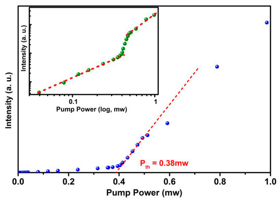 Furthermore, InAs/GaAs quantum-dot microcavity laser on exact Si (001) via (111)-faceted Si hollow structure has been demonstrated. By using a (111)-faceted Si (001) hollow substrate, GaAs buffer and dislocation filter layer were epitaxially grown to reduce the threading dislocations in the subsequent QD laser structure’s growth. The active layer consisting of five periods of InAs/GaAs dot-in-a-well (DWELLs) structure was sandwiched between Al0.35Ga0.65As claddings with a 600-nm-thick Al0.65Ga0.35As sacrificial layer. The structural characterization of the QD active layer has been presented in earlier work [69]. The schematic diagram and corresponding SEM image of the laser structure are shown in Figure 8. The microdisk size of 4 μm is chosen for laser characterization. The L-L characterization of Si-based microdisk laser is shown in Figure 9, with a threshold pump power of approximately 380 μW, which is similar to those on the GaAs substrate. The inset of Figure 9 shows the log–log plot of the L-L curve, revealing an ‘S-shaped’ nonlinear transition.