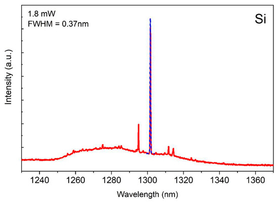 Figure 10 shows the emission spectrum under an optical pump power of 1.8 mW for an O-band InAs/GaAs QD microdisk laser. The laser spectrum shows a full-width-half-maximum (FWHM) of 0.37 nm, which indicates a cold cavity quality factor (Q) of 3645. The spacing between the adjacent modes in the same radial order agrees well with the calculated free spectral range (18 nm) for the first-order mode of the microdisk laser. The QD microcavity laser on the CMOS-compatible Si (001) substrate could potentially be implemented in the application of low-power integrated light sources in the near future.
