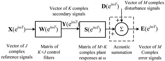 The block diagram of the multichannel ANC (MCANC) system is shown in Figure 1. Acoustic summation of the disturbance signals D ( e j ω T ) and secondary source signals (at the error microphone locations) yields a complex vector of residual signals that can be represented in steady-state by