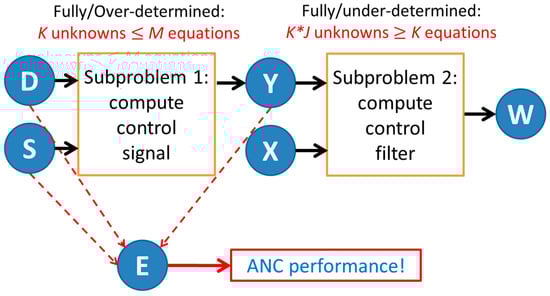 The aim of ANC is to obtain optimal control filters that yield the optimum performance based on certain objective functions [22]. Before deriving the optimal solution for the control filters, we delve into the formation of the multichannel ANC problem. As shown in Figure 2, the ANC problem can be readily divided into 2 subproblems. In the subproblem 1, our aim is to obtain the optimal secondary outputs Y from input signals D and secondary paths S so that the cost function can be optimized. In the subproblem 2, based on optimal secondary outputs Y and reference signals X , we derive the optimal control filters W . It is intuitive that the performance of the ANC system is only directly related to secondary outputs, whereas the control filters do not contribute directly as long as desired secondary output can be obtained with the control filters. This separation helps to simplify the multichannel ANC problem as follows.