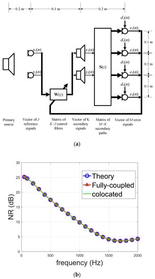 Time-domain free-field simulation of a 2-2-4 overdetermined system (for problem 1) with 2 reference microphones, 2 secondary sources, and 4 error microphones is considered using a setup illustrated in Figure 3a, which is similar to that in [14]. The horizontal distance from the primary source to the reference microphones, secondary sources, and error microphones are 0.2 m, 0.1 m, and 0.2 m, respectively. The spacing between the two reference microphones and secondary sources is 0.2 m, whereas the four error microphones are spaced at 0.1 m, 0.2 m, and 0.1 m. The primary noise signal is captured by the reference microphones as x 1 ( n ) , x 2 ( n ) , and by the error microphones as d 1 ( n ) , d 2 ( n ) , d 3 ( n ) , d 4 ( n ) . The secondary sources y 1 ( n ) , y 2 ( n ) are generated by filtering the reference microphone signals using the adaptive filters based on the above two FxLMS algorithms, which then go through the secondary paths and are summed with the primary noise at the error microphones, resulting in the error microphone signals e 1 ( n ) , e 2 ( n ) , e 3 ( n ) , e 4 ( n ) . The noise reduction performance (after convergence) of the above two adaptive FxLMS algorithms is shown in Figure 3b. The results reveal that the noise reduction performance of both the fully-coupled based on the adaptation equation (8) and the colocated method based on the adaptation Equation (11) are identical with the theoretical performance, verifying the analyses above, in particular, Equations (3) and (13).