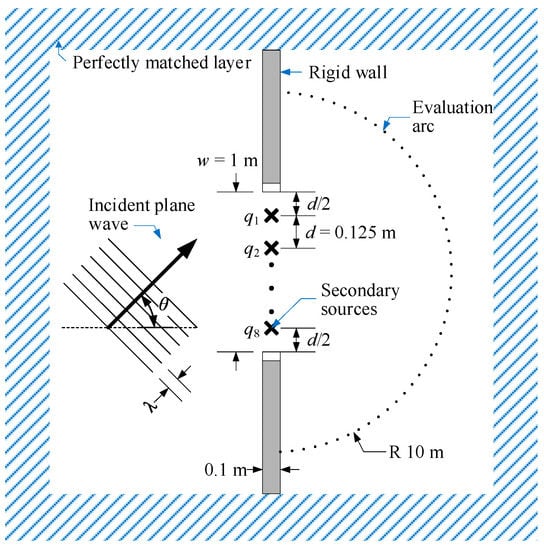 The finite element method (FEM) computation plane, as depicted in Figure 4, is a 2D representation of a rectangular aperture (i.e., open window) in a rigid thin wall. Eight secondary sources are placed 0.125 m apart within the 1-m wide window to control the incident plane waves entering the window at angle θ , according to the guidelines in [27]. The entire computation plane is enclosed by a perfectly-matched layer so that all waves are damped to simulate a free-field condition. The acoustic power radiation from the window due to the noise can be calculated based on the far-field formulation as [21]