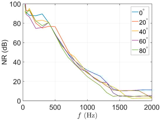 Based on the optimal secondary source output computed from (3), we can obtain the theoretical optimal noise reduction performance for the setup specified in Figure 4. The noise reduction at five angles of incidence with frequencies from 0 to 2000 Hz is illustrated in Figure 5. Noise reduction performance reduces as frequency increases, as dictated by the control source separation distances and its relative position in the aperture [27,29]. The result presented in Figure 5 is consistent with the upper frequency limit of control defined in [27] as f < c / d ( 1 + | sin θ | ) . The attenuation performance is identical for all incidence angles at low frequencies but deteriorates rapidly as they approach their upper frequency limits of control.