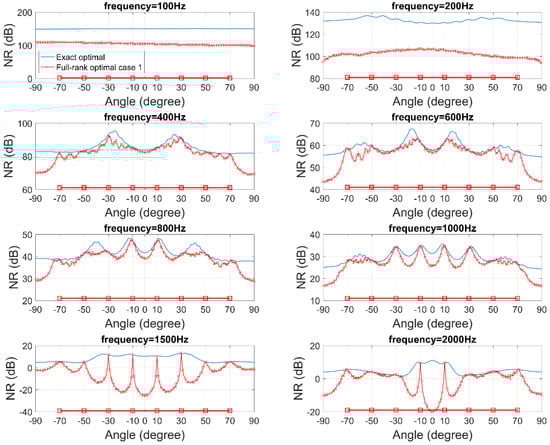 In Figure 7, we compare the full-rank optimal filter #1 with the exact optimal filter obtained for each incidence individually. The full-rank filter could only achieve identical performance for those angles selected in the full-rank factorization, except for lower frequencies (e.g., f = 100, 200 Hz), where the noise reduction is significantly large, indicating that the residue noise pressure is close to zero and might be affected by the numerical precision of the simulation. For incidence angles other than the eight incidences used in formulating the filter, the noise reduction performance is degraded. The degradation increases in severity when the incidence angles are farther away from the selected angles, especially for higher frequencies.