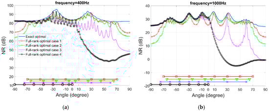 Figure 8. Noise reduction performance of four cases of the full-rank optimal filters, at frequency (a) 400 Hz, (b) 1000 Hz.