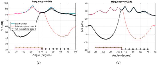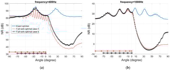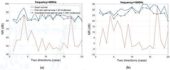 Figure 9. Noise reduction performance of two cases of the full-rank optimal filters that only consider the negative directions, at frequency (a) 400 Hz, (b) 1000 Hz.
