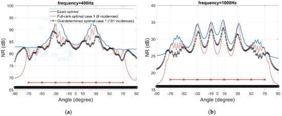 Figure 11. Noise reduction performance of full-rank optimal filter case 1 and overdetermined optimal filter case 1, at frequency (a) 400 Hz, (b) 1000 Hz.