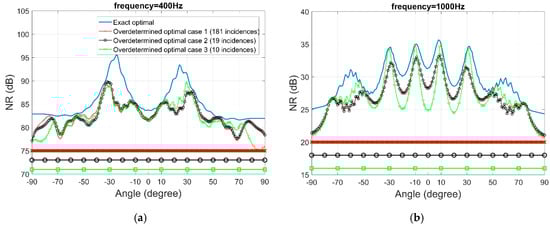 Figure 12. Noise reduction performance of three overdetermined optimal filter cases, at frequency (a) 400 Hz, (b) 1000 Hz.