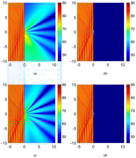 Figure 14. 2D sound pressure level (dB) of (a) primary noise only, (b) exact optimal control, (c) full-rank optimal control (case 1), and (d) overdetermined optimal control (case 1 with 181 incidences) for two noise sources at 1000 Hz. The units of the axes are meters.