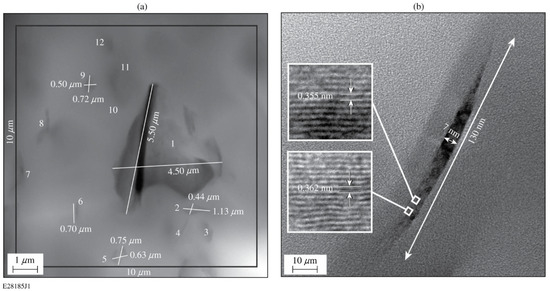 (a) Low-resolution (10 × 10-µm2 area), representative TEM image of 1-wt% graphene PET-DLA 4060 nanocomposite. Twelve (most visible in the view) flakes are identified and the sizes of several flakes are listed. (b) HRTEM of the 7-nm × 130-nm nanoflake. Insets show images of graphene planes and interplanar distances from two different sections of the nanoflake (marked as squares).