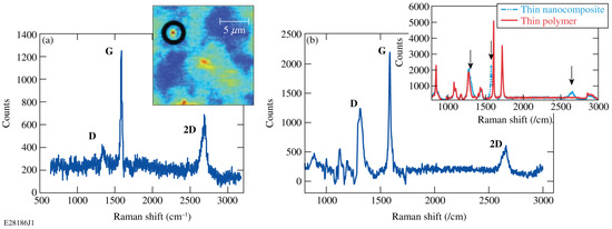 (a) Background-subtracted Raman spectrum from a FGL nanoflake embedded in PET-DLA 4060 copolymer matrix. The three prominent features are the D peak at ~1340 cm−1, the G peak at ~1580 cm−1, and the 2D peak at 2680 cm−1. The inset presents a scanning fluorescence image of the region from which the spectrum was taken, with the studied nanoflake circled. For the images, the excitation wavelength was 632.8 nm and the laser power was 600 µW. (b) Background-subtracted Raman spectrum of graphene nanoflakes obtained by subtraction of the spectrum of neat PET-DLA 4060 copolymer, used as the graphene nanocomposite matrix. The latter two spectra are both shown in the inset in (b), with arrows pointing to the characteristic features of the nanocomposite. The positions of the main peaks in the main panel are the D peak at ~1311 cm−1, the G peak at ~1586 cm−1, and the 2D peak at 2661 cm−1.