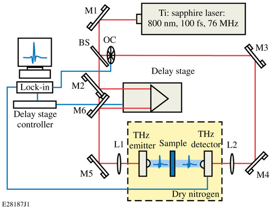 Schematic diagram of a THz-TDS setup. L1, L2: optical lenses; M1–M6: dielectric mirrors; BS: beam splitter, and OC: optical chopper.
