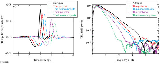 (a) Time-resolved transient signals for the tested thin and thick polymers and 1-wt% graphene nanocomposite samples and the empty spectrometer (nitrogen). (b) The corresponding power spectra showing absorption of the samples. Note: The thin samples consist of the PET-DLA 4060 copolymer, while the thick ones consist of PET-DLA 6040.