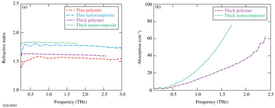 (a) Index of refraction and (b) absorption spectra for the tested neat copolymer and 1-wt% graphene nanocomposite samples. Note: The thin sample consisted of PET-DLA 4060 copolymer, while the thick one consisted of PET-DLA 6040. The data points were trimmed according to sample bandwidth (see Figure 5b).