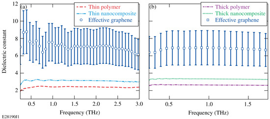 where δ is the volume ratio of graphene nanoflakes to the entire sample volume. Of course, the 1-wt% ratio does not reflect the volume ratio, so we used the TEM images of our samples (see Figure 2a) to estimate the volume percentage of the randomly distributed and orientated graphene nanoflakes inside our nanocomposite. The calculation results of are shown in Figure 7 as symbols. The error bars represent an uncertainty of ~30% in our evaluation of δ. Comparing the results presented in Figure 7a,b, we see that ignoring the low-frequency section of for the thin sample (mentioned in earlier Fabry–Pérot reflections), the values for both graphene nanocomposite samples are very close to each other and are ~7 ± 2.