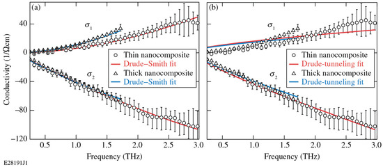 Next, our spectra were fitted using the Drude–Smith model [38] (solid lines in Figure 8a), and what we call the Drude-tunneling model presented in [39] (solid lines in Figure 8b). The Drude–Smith model is given by