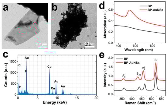 Transmission electron microscopic (TEM) images of black phosphorus (BP) sheet (a) and BP-AuNSs (b). (c) EDX pattern of BP-AuNSs. (d) Ultraviolet-visible-near infrared (UV-vis-NIR) absorbance spectra of the nanostructures. (e) Raman spectra of BP and BP-AuNSs.