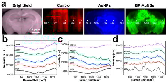 (a) Full-scale label-free SERS imaging of mouse brain section. (b–d) Raw Raman spectral lines collected from five pixel points in the brain sections treated without (b) or with nanostructures (AuNPs (c) and BP-AuNSs (d)).
