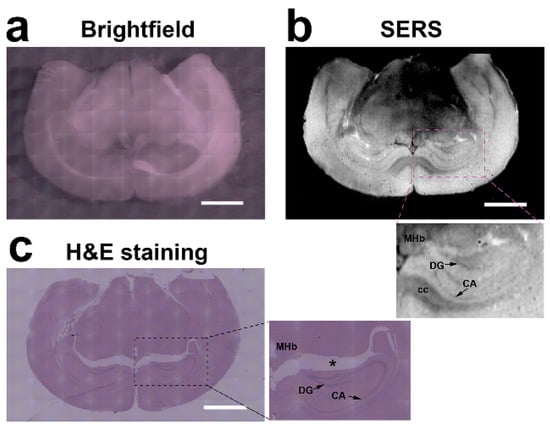 Accurate SERS texture analysis of brain tissue. (a) Brigthfield image; (b) SERS image induced by BP-AuNSs using the empty modelling approach. (c) Hematoxylin and eosin (H&E) staining of brain tissue section. Enlarged images showed the hippocampus (DG, dentate gyrus; CA, Ammon’s horn), medial habenular nucleus (MHb) and corpus callosum (cc) regions. The asterisk (*) showed the loss and displacement of tissue during section preparation process. Scale bar: 2 mm.