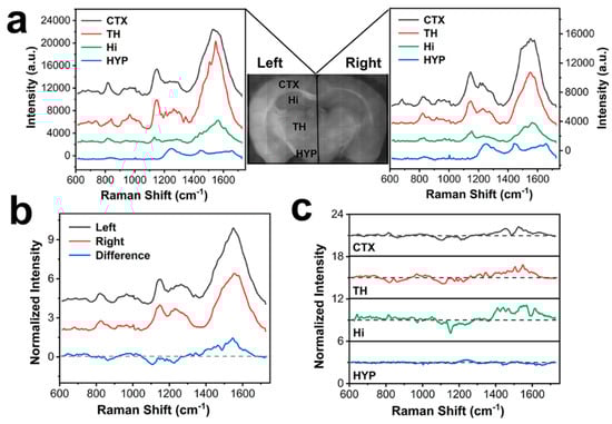 To investigate the differences in chemical composition in different encephalic regions, more than 20 SERS spectral lines were acquired from each compartment. Figure 6a showed the mean SERS spectra of four different encephalic regions (cerebral cortex (CTX), hypothalamus (HYP), thalamus (TH) and hippocampus (Hi)) in the left and right hemispheres. It could be seen that the enhanced Raman signals of brain tissues were evidently varied among the major brain structures. The molecular components in CTX and TH demonstrated the most enhanced SERS signals, which might be ascribed to the higher neurocyte density in these encephalic regions, as the perineuronal nets were intensely positively charged that could closely be bonded with the negatively charged SERS substrate []. The Raman signals of brain tissues in HYP experienced a weak increase that could be ascribed to the fewer cells in HYP and weak affinity of the biochemical components and BP-AuNSs.