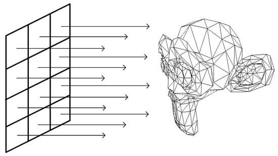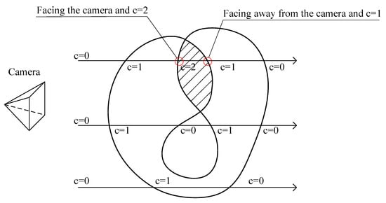 To compute the partial derivatives of our proposed self-intersection penalty term, it is necessary to divide the vertices into three sets: , and . A camera screen with pixels arranged in a square with H rows and W columns is set in front of the 3D mesh such that the orthogonal projection of the 3D mesh falls totally inside the screen. It is worth noting that the camera mentioned here is used only to emit detection rays, not for rendering and visualization. Detection rays are emitted from the center of each pixel to detect self-intersection, as is shown in Figure 3. The detail of the detection and classification is presented in Algorithm 1. To make our algorithm more intuitive, a schematic representation is given in Figure 4.