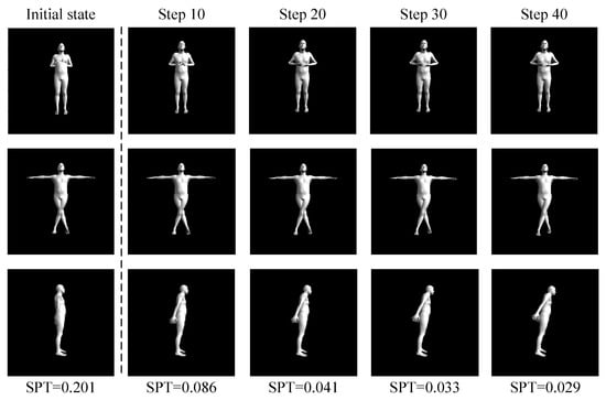 Images rendered from the iterative process. First column: Images rendered from initial meshes with self-intersection. Second through fourth columns: Images rendered from optimized meshes every 10 iterations. The self-intersection penalty term (SPT) values in the bottom of each column denote the average SPT of three SMPL models.