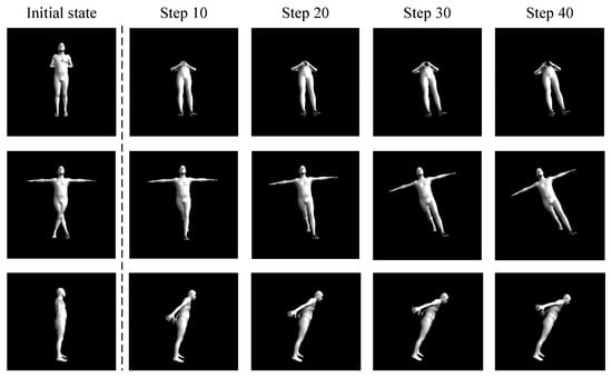 In order to show the necessity of gradient normalization which is presented in Equation (11), an experiment with same conditions as the experiment described above, but without gradient normalization, was conducted. The visualized result is shown in Figure 7. Since there are great differences between the areas of triangles in the body meshes, gradients of vertices differ greatly in magnitudes. This often leads to unstable iterations and unpredictable results and we demonstrated that this problem can be solved by gradient normalization.