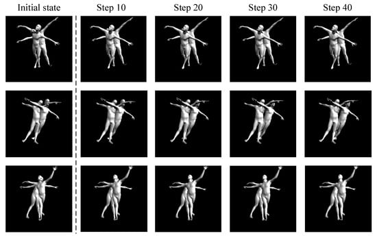 Images rendered from the iterative process with two SMPL models. First column: Images rendered from initial meshes with self-intersection. Second through fourth columns: Images rendered from optimized meshes every 10 steps.