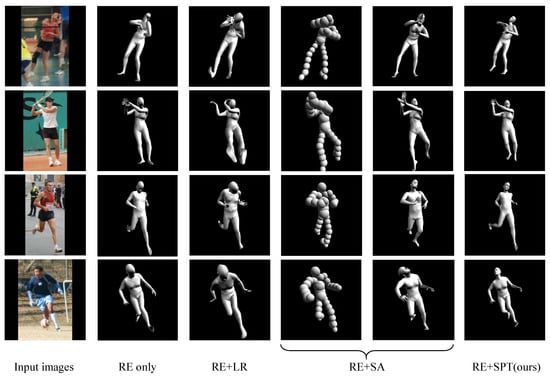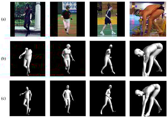 Visualized results of 3D pose estimation. Images in row (a) are the input images, images in row (b) are fitting results without SPT, images in row (c) are fitting results with SPT.