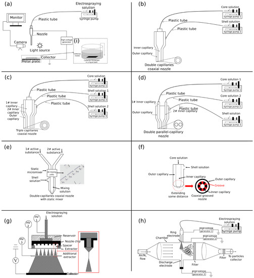 Common examples of electrospraying apparatus, (a) single-capillary electrospraying, (b) double-capillaries coaxial nozzle, (c) triple-capillaries coaxial nozzle, (d) double parallel-capillaries coaxial nozzle, (e) double parallel-capillaries coaxial nozzle with static micromixer, (f) double-capillaries coaxial nozzle with grooved structure, (g) multiplexed electrospraying setup with several electrospray sources operating in parallel and an extractor, (h) electrospraying via a nozzle-ring setup inside a glass chamber under air flow, and (i) electrospraying device with liquid bath collector (modified from [37,40,65,89,90,91,92,93,94]).