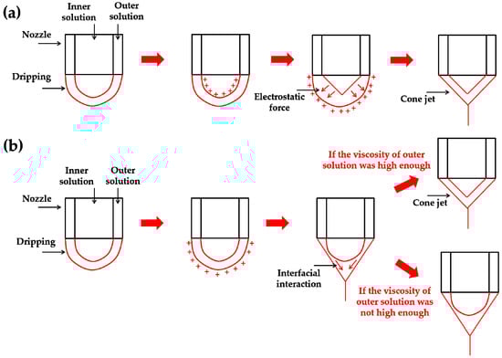 In the use of a coaxial electrospraying, the formation of cone-jet at the tip of the nozzle is also closely related to the electrical conductivities of inner and outer liquid phases [72,131]. On the one hand, for a higher electrical conductivity of the inner liquid than the outer one, the free charges are located at the interface. In this case, inner liquids regard as the driving component and dominate the formation of the Taylor cone. Then, inner droplets are stretched into the conical shape due to the electrostatic forces acting on their surface, which leads to the transfer of the free charges to the surface of the outer phase. Finally, the formation of the Taylor cone of the outer liquid is done when the electrostatic attractions acting on the surface of outer liquid counteract the viscoelastic forces and surface tension (Figure 3a).