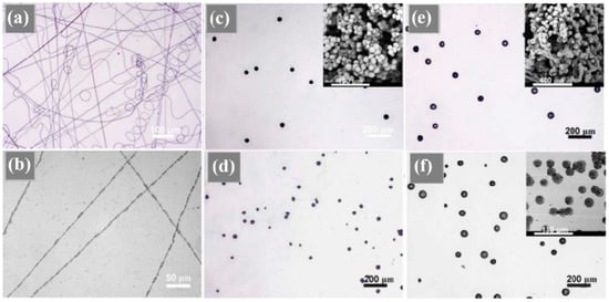The effects of polymer molecular weight and solution concentration on the results of PCL electrospraying (a) smooth fibers from PCL with 80,000 g/mol, 10 wt.%; (b) beaded fibers from PCL with 80,000 g/mol, 0.5 wt.%; (c) particles from PCL with 45,000 g/mol, 9 wt.%; (d) particles from PCL with 45,000 g/mol, 11 wt.%; (e) particles with fibrils from PCL with 45,000 g/mol, 30 wt.%; (f) particles from PCL with 10,000 g/mol, 30 wt.% (reprinted with permission from Taylor & Francis Ltd., http://www.tandfonline.com [98]).